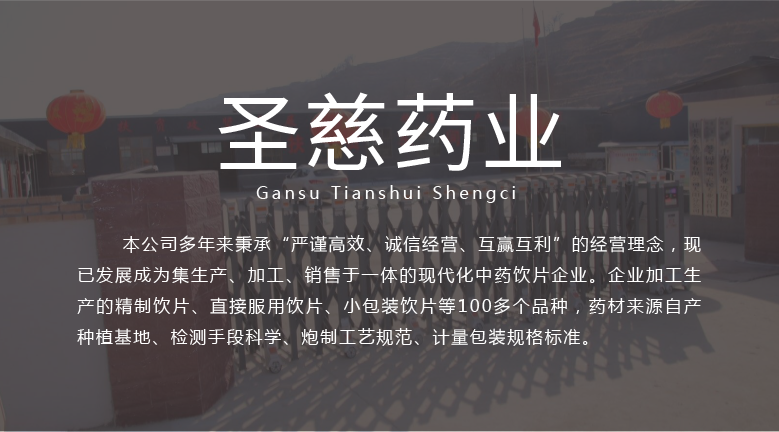 甘肅天水圣慈藥業(yè)有限公司成立于2016年11月8日,注冊(cè)資本500萬(wàn)元,位于甘肅省天水市張川回族自治縣張川鎮(zhèn)中城南路,本公司多年秉承“嚴(yán)謹(jǐn)高效、誠(chéng)信經(jīng)營(yíng)、互贏互利”的經(jīng)營(yíng)理念,現(xiàn)已發(fā)展成為集生產(chǎn)、加工、銷售于一體的現(xiàn)代化中藥飲片企業(yè)。企業(yè)加工生產(chǎn)的精制飲片、直接服用飲片、小包裝飲片等100多個(gè)品種,藥材來(lái)源自產(chǎn)種植基地、檢測(cè)手段科學(xué)、炮制工藝規(guī)范、計(jì)量包裝規(guī)格標(biāo)準(zhǔn)。